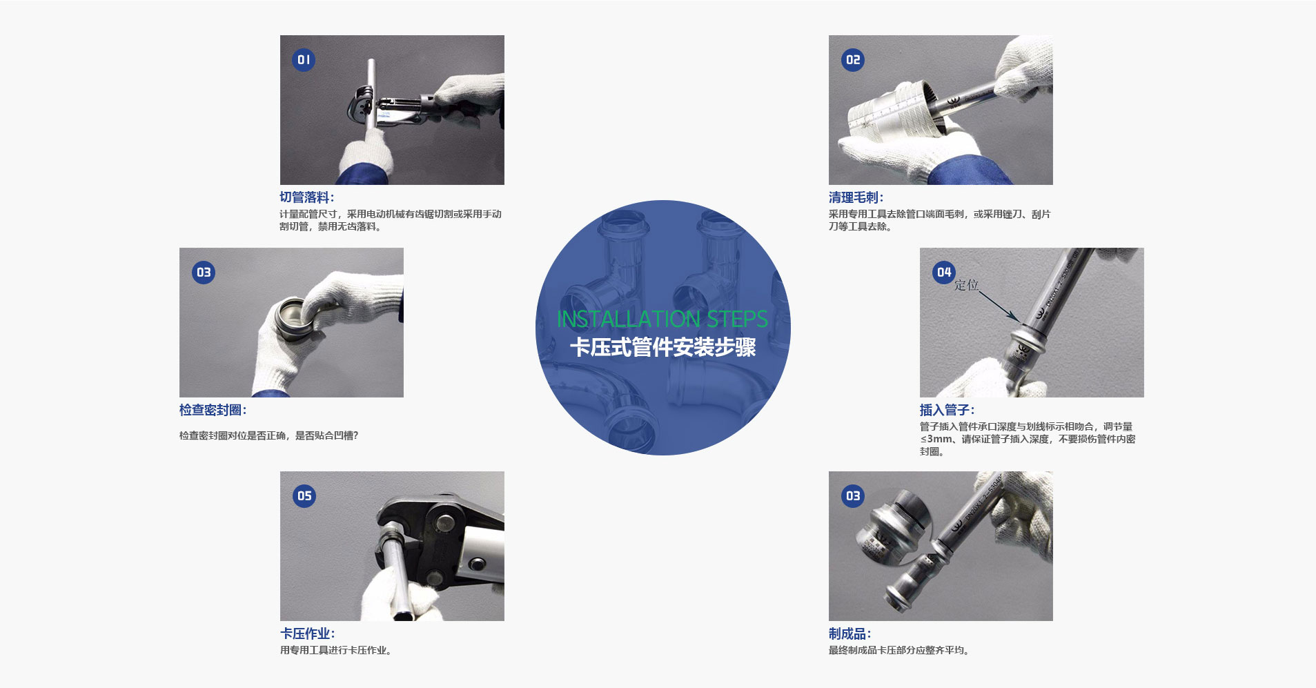 9、合適嵌入式安裝:卡壓式管件滿足嵌入式安裝要求,可明裝,也可埋墻安裝